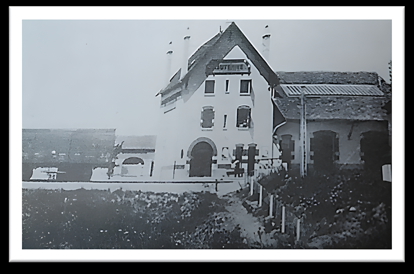 A noter la large baie cintrée, au rez-de-chaussée, ornée d’un appareillage de briques, et l’utilisation de petits carreaux de faïence orange et gris pour la signalétique sur le bâtiment.